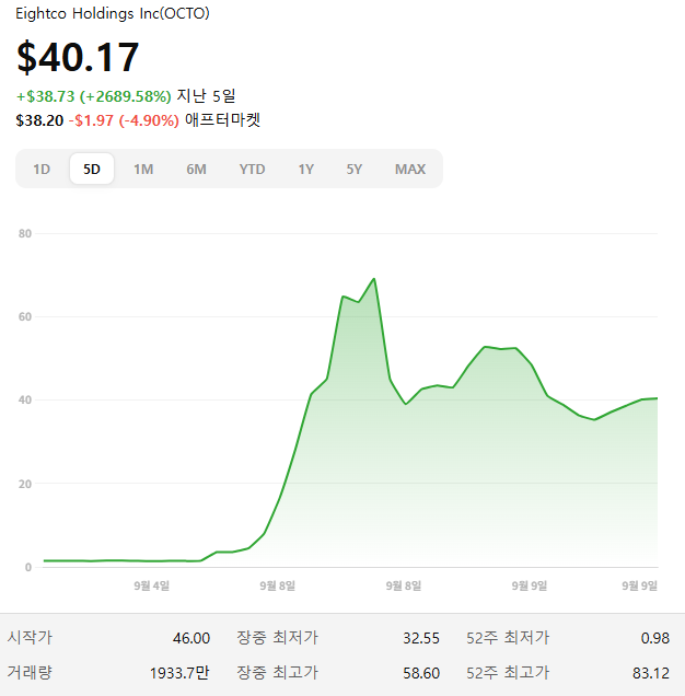 2025년 9월 8일, 미국 나스닥에서 거래되는 에이트코홀딩스(Eightco Holdings, 티커: OCTO)의 주가가 비정상적인 폭등을 기록했습니다.