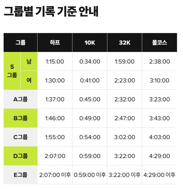 • 기록증을 제출하지 않은 참가자는 기록에 관계없이 출발 그룹 중 가장 마지막 그룹으로 자동 배정됩니다.