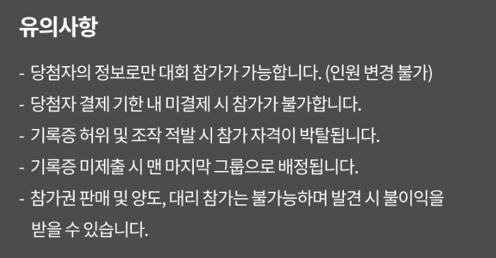 • 참가권은 판매·양도·재판매가 모두 금지되어 있으며, 대리 참가 역시 허용되지 않습니다. 이를 위반할 경우 향후 대회 참가에 불이익이 발생할 수 있습니다.