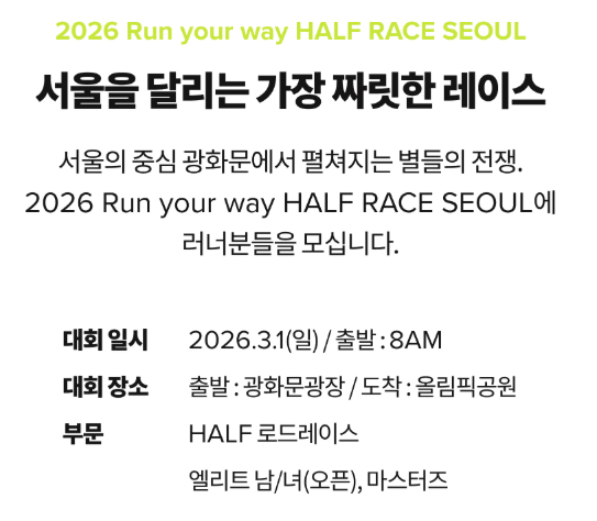 | 2026 Run your way 하프레이스 서울 래플접수|광화문 하프마라톤 참가방법·일정·기록제출까지 한 번에 정리 (0) | 2025.12.18 |