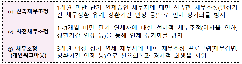 | 사적 채무조정 | - 단기·소액 연체 및 연체 우려자 대상 워크아웃 상담 - 이자율·원금 조정을 위한 전문 변호사의 서류 작성 지원 ![]() |
