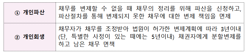| 공적 채무조정 | - 상환 불가자 대상 개인파산·개인회생 지원 - 변호사 수임료, 인지세, 송달료 등 제반 비용 포함 ![]() |